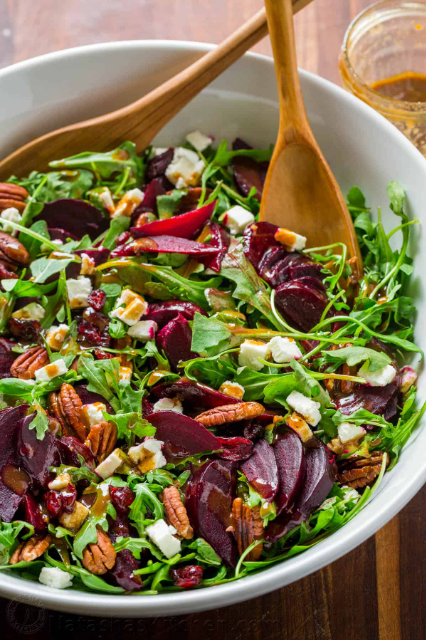 Popular beet salad ingredients include goat cheese, walnuts, arugula, feta cheese, oranges, and spinach.