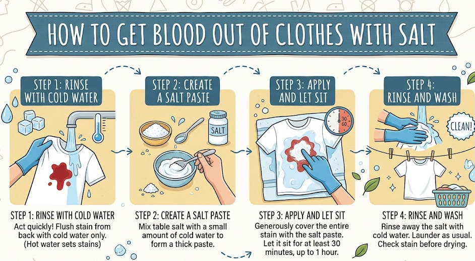 Salt helps draw out the blood from the fabric, making it easier to remove. This method is simple, affordable, and widely accessible.